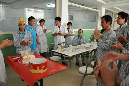 今天,恰逢高长国的生日,病区医生护士等工作人员以及他的病友们为其点燃了生日蜡烛,唱起了生日祝福歌,并一起许愿祈祷吹熄蜡烛,预祝高长国早日有效治疗,此时的高长国与刚入院时判若两人,自言自语的症状完全消失,整个人整洁清爽,满脸笑意,看上去和健康人没什么区别。当李护士长将生日蛋糕递给他时,高长国激动的说:“谢谢护士长,谢谢大家给我过生日,这是我这么多年来过的次生日,真的谢谢大家了!”看着高长国憨厚的脸上洋溢着幸福的笑容,病区所有工作人员也都会心的露出了满意的微笑。